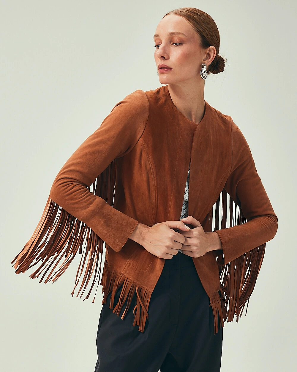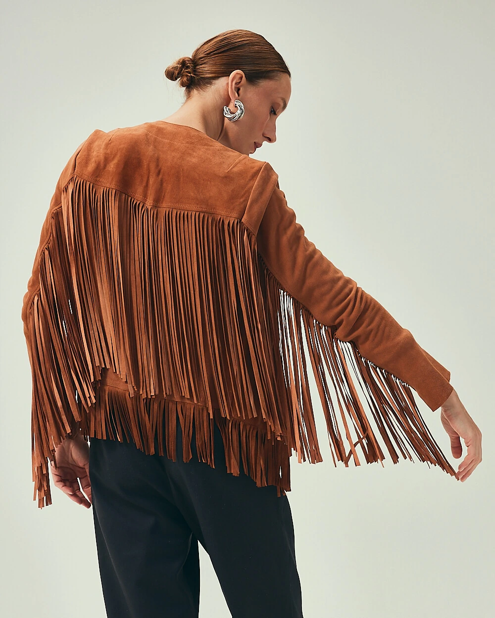Descolada e delicada, essa jaqueta de couro em camurça é a peça perfeita para quem busca estilo e sofisticação em um só look. Com franjas que percorrem todo o comprimento das costas e braços, ela traz um movimento único, destacando-se por sua textura macia e de qualidade premium.
