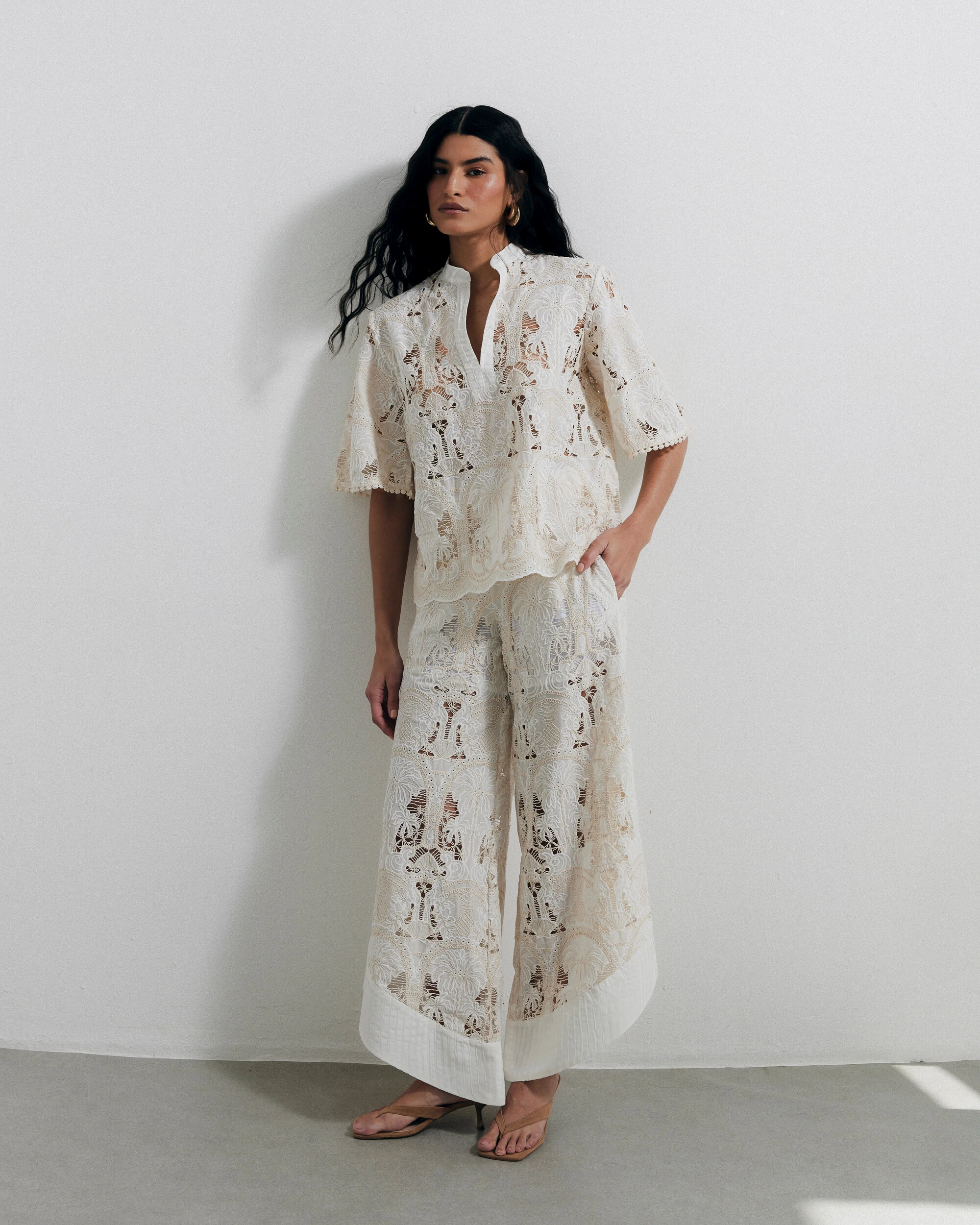 Camisa em tecido leve com bordado artesanal desenhado, revelando textura e detalhes exclusivos. Possui gola padre e decote em “V”, que equilibram sofisticação e frescor. As mangas curtas e o caimento solto tornam a peça ideal para composições elegantes e descontraídas.