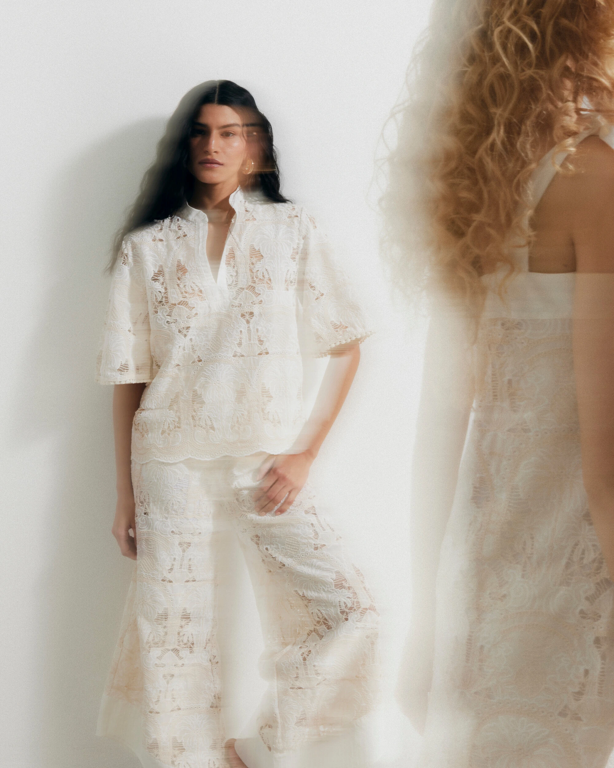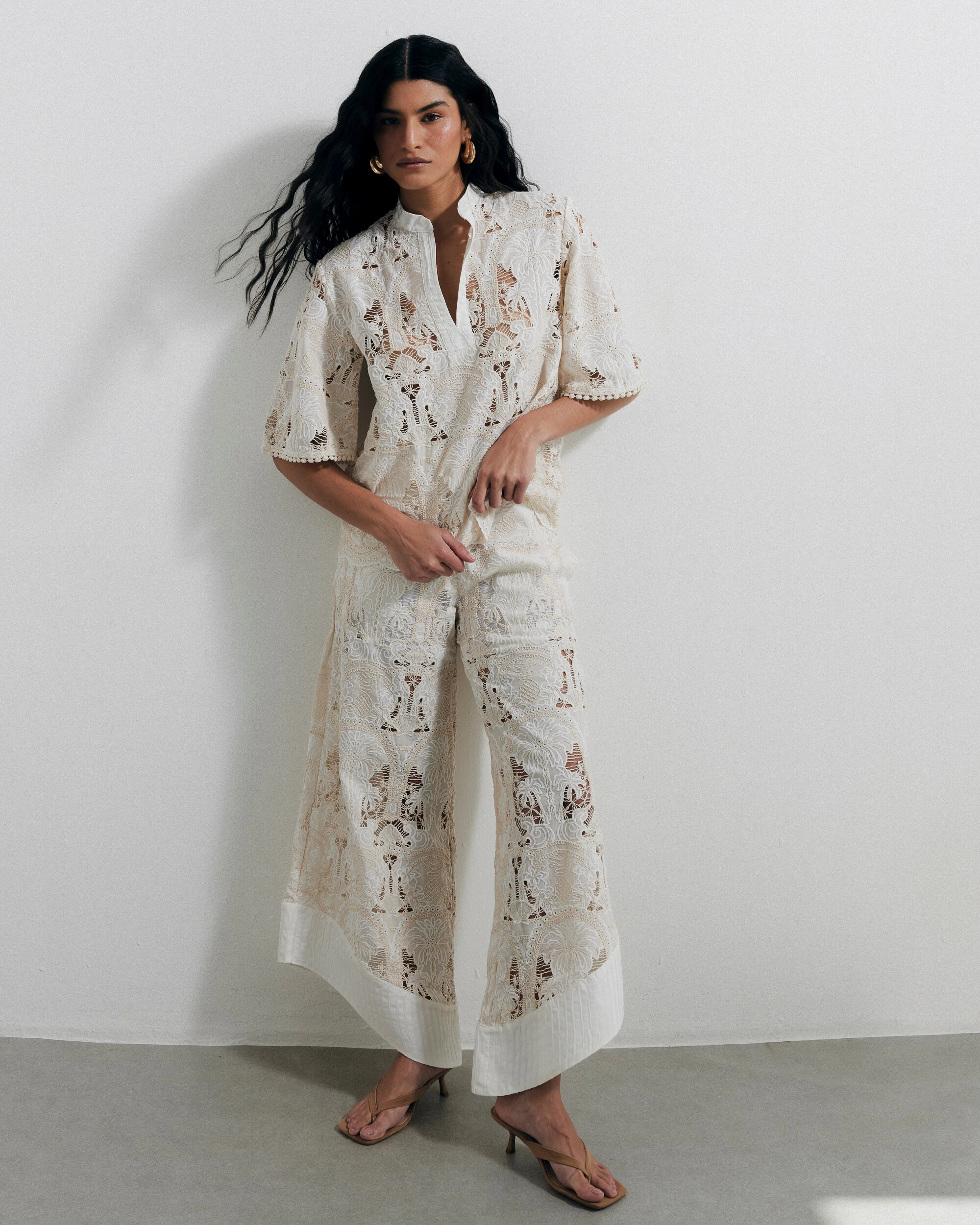 Calça em tecido bordado com desenho elaborado e acabamento em tecido liso na barra. O caimento reto e fluido traz movimento e leveza, enquanto o trabalho do bordado confere um toque artístico e único. Uma peça versátil que transita entre o casual refinado e o sofisticado.