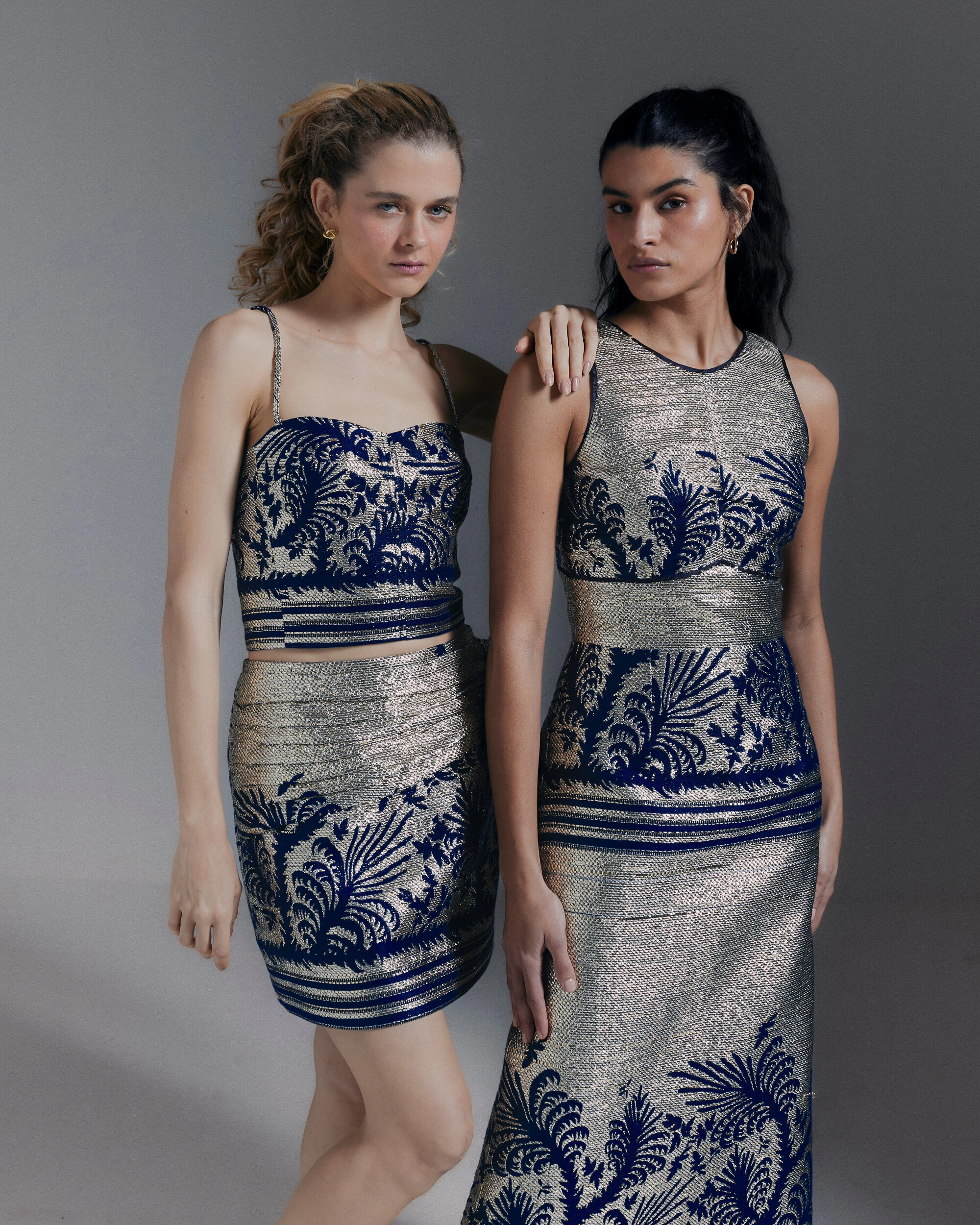 O top em jacquard dourado e azul é uma peça estruturada que une elegância e força visual. Confeccionado em tecido encorpado com desenho exclusivo, combina o brilho sutil do dourado com o contraste do azul profundo. O decote em formato coração e as alças finas valorizam o colo, trazendo um toque feminino e contemporâneo à produção.