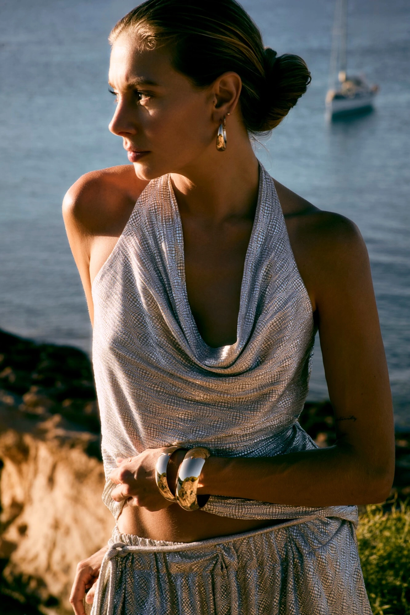 Top confeccionado em lamê, de textura suave e brilho refinado. Possui decote degagê que valoriza o colo e amarração no pescoço, deixando as costas à mostra com caimento leve e elegante. Uma peça versátil, que combina o toque moderno do metalizado com a fluidez ideal para ocasiões especiais.