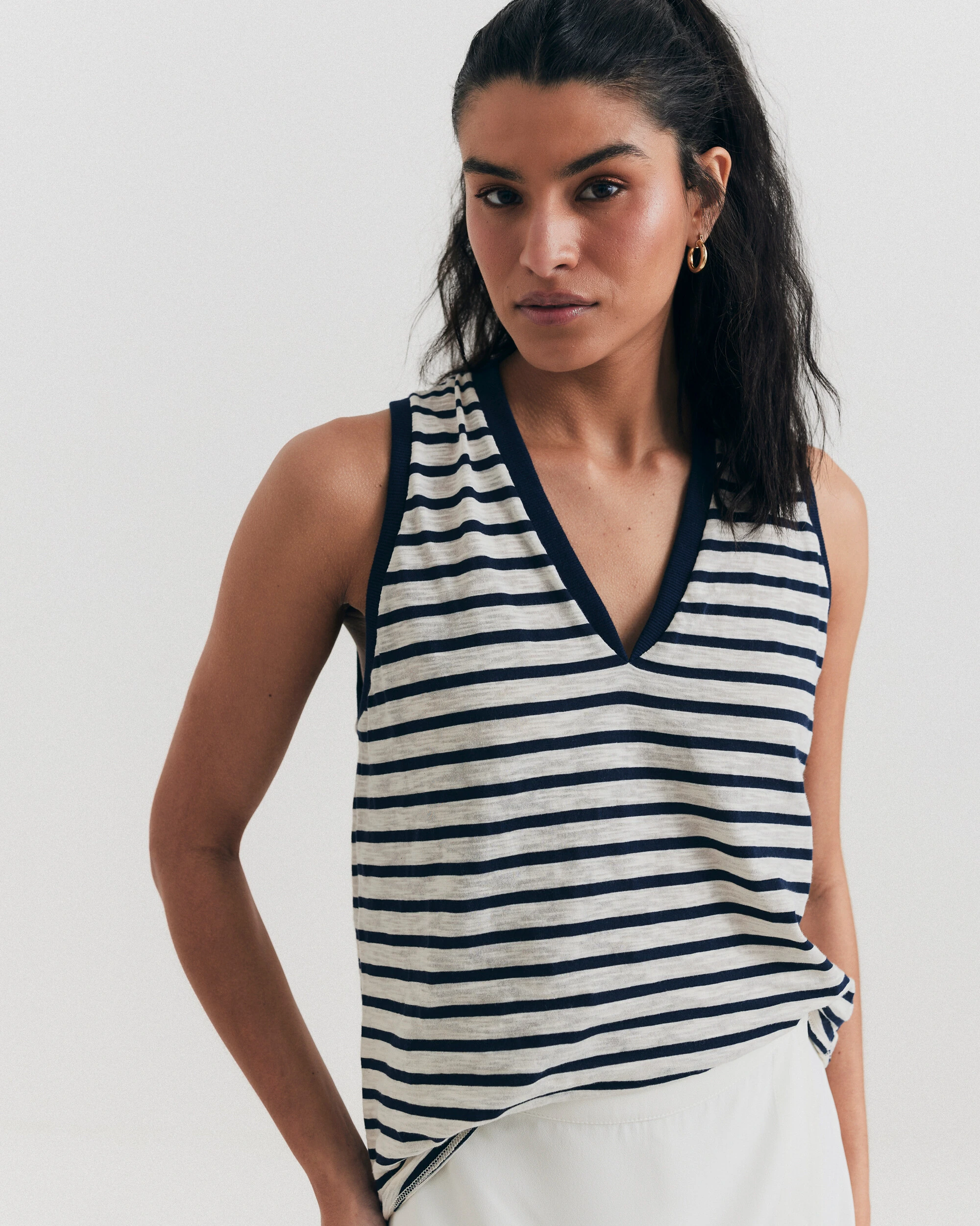 Regata em V listrada com detalhe nos decotes para deixar os seus looks ainda mais charmosos no dia a dia!