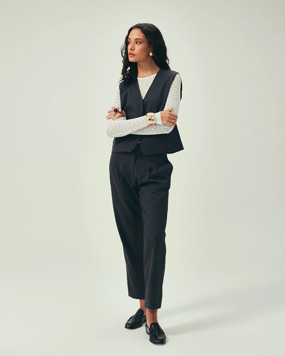 Perfeita para usar em sobreposições com coletes, jaquetas ou peças de alfaiataria.