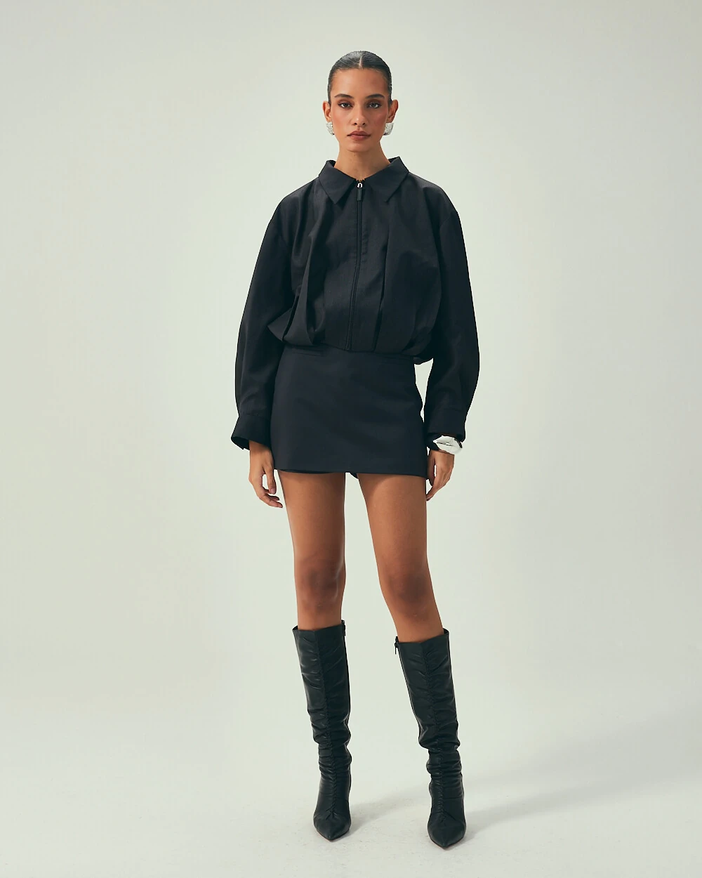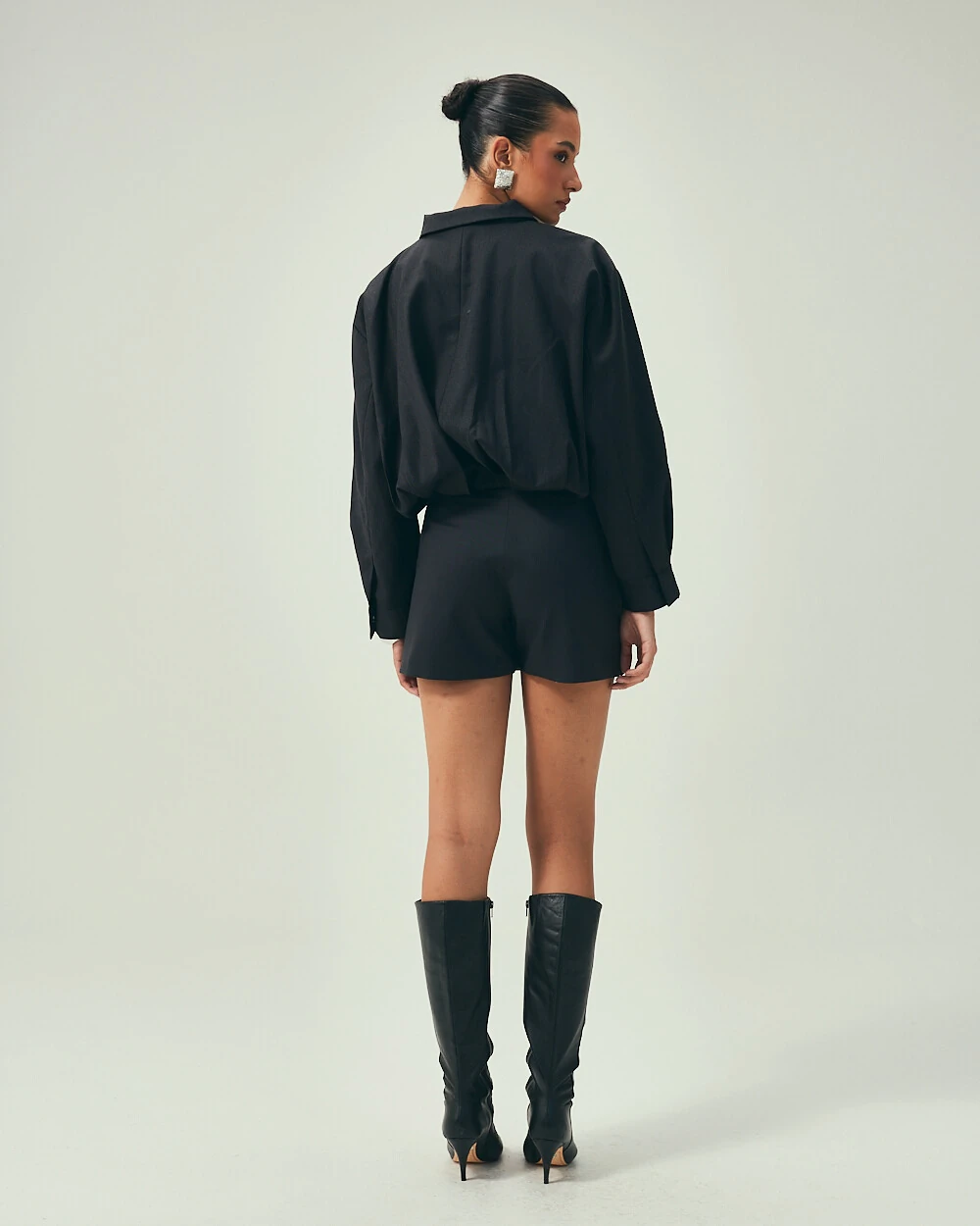 O Shorts Saia Lã Fria combina a estética minimalista da alfaiataria com uma proposta contemporânea e feminina. O cós inteiro com cintura levemente baixa cria um visual elegante e atual, valorizando a silhueta com linhas limpas e bem definidas.