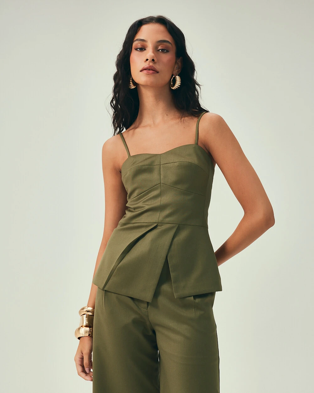A modelagem estruturada destaca a silhueta com precisão, enquanto as pregas estratégicas e a pala transpassada formam um leve efeito peplum na barra, trazendo movimento e acentuando a cintura de forma sutil.