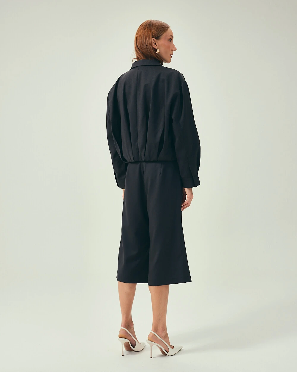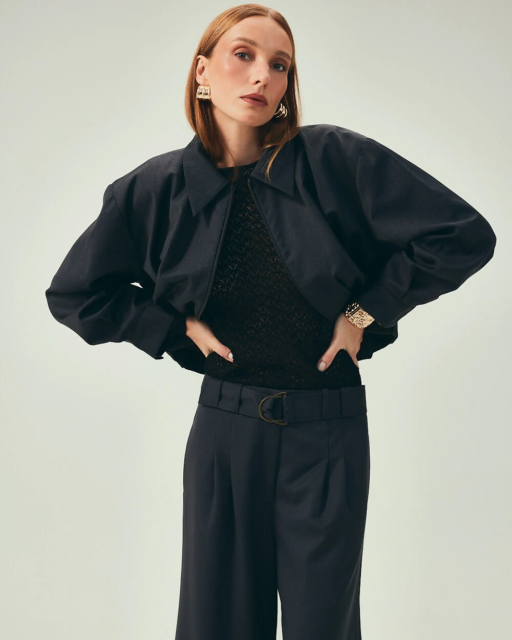 O modelo possui vista tradicional com transpasse, fechando com zíper metálico destacável e botões de pressão em níquel, criando um visual limpo e sofisticado. A barra estruturada, com pregas macho, forma um leve efeito balonê que valoriza a silhueta e adiciona personalidade ao look.