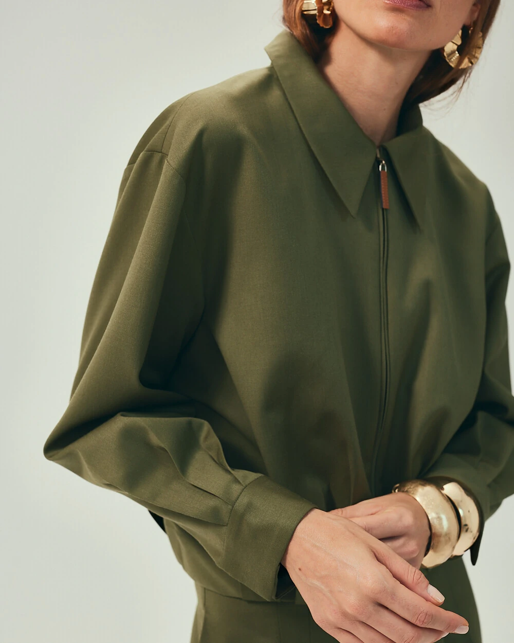 O modelo possui vista tradicional com transpasse, fechando com zíper metálico destacável e botões de pressão em níquel, criando um visual limpo e sofisticado. A barra estruturada, com pregas macho, forma um leve efeito balonê que valoriza a silhueta e adiciona personalidade ao look.