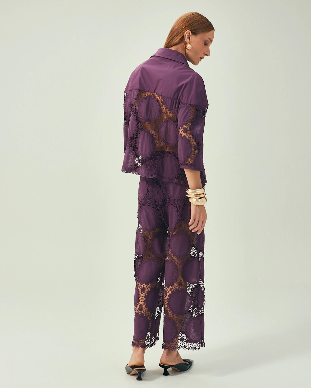 Confeccionada em algodão tingido, a Calça Riviera traz toque macio e caimento leve, com um visual marcado pelos recortes com aplicação de textura vazada, que criam transparências sutis e enriquecem a peça. A modelagem reta e levemente ampla alonga a silhueta, enquanto o acabamento na barra reforça a proposta artesanal e sofisticada.