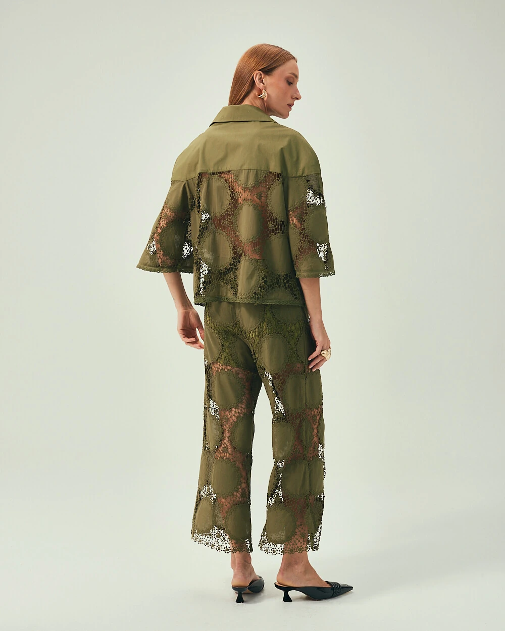 Confeccionada em algodão tingido, a Calça Riviera traz toque macio e caimento leve, com um visual marcado pelos recortes com aplicação de textura vazada, que criam transparências sutis e enriquecem a peça. A modelagem reta e levemente ampla alonga a silhueta, enquanto o acabamento na barra reforça a proposta artesanal e sofisticada.
