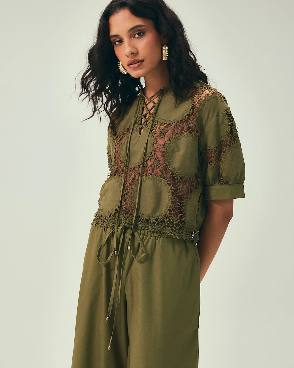 Confeccionada em algodão tingido, a Bata Riviera combina toque macio e caimento leve com um visual rico em detalhes. A peça se destaca pelos recortes com aplicação de textura vazada, que criam transparências sutis e trazem profundidade ao look. O decote com amarração e as mangas com acabamento dobrado reforçam a proposta artesanal e sofisticada.
