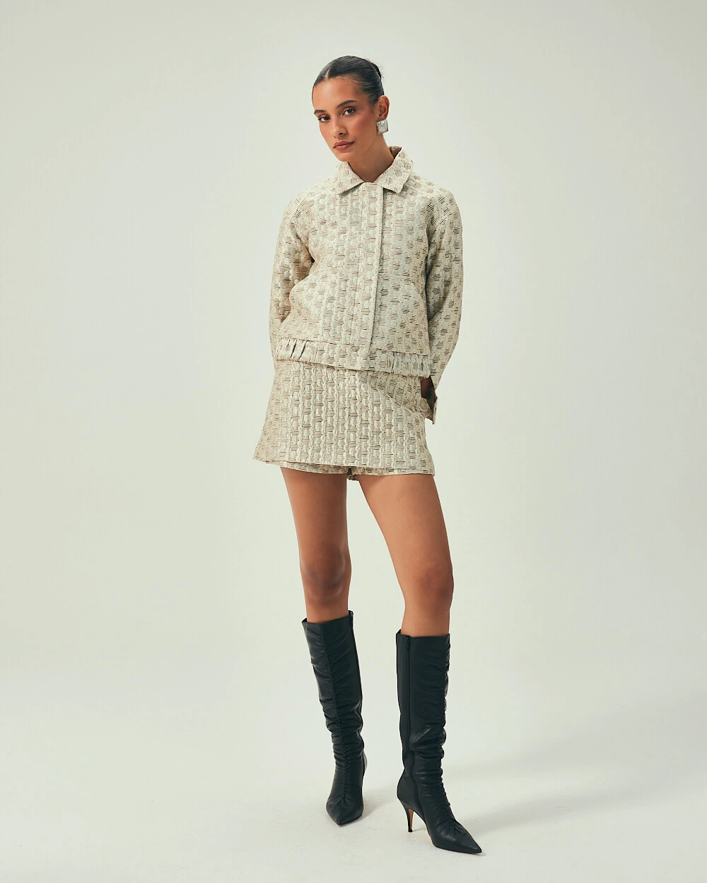 Em jacquard poá importado, o shorts saia traz estrutura e desenho em uma proposta moderna. A modelagem valoriza a silhueta com conforto, enquanto a textura do tecido adiciona profundidade e destaque ao look.