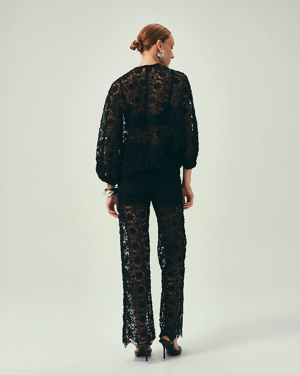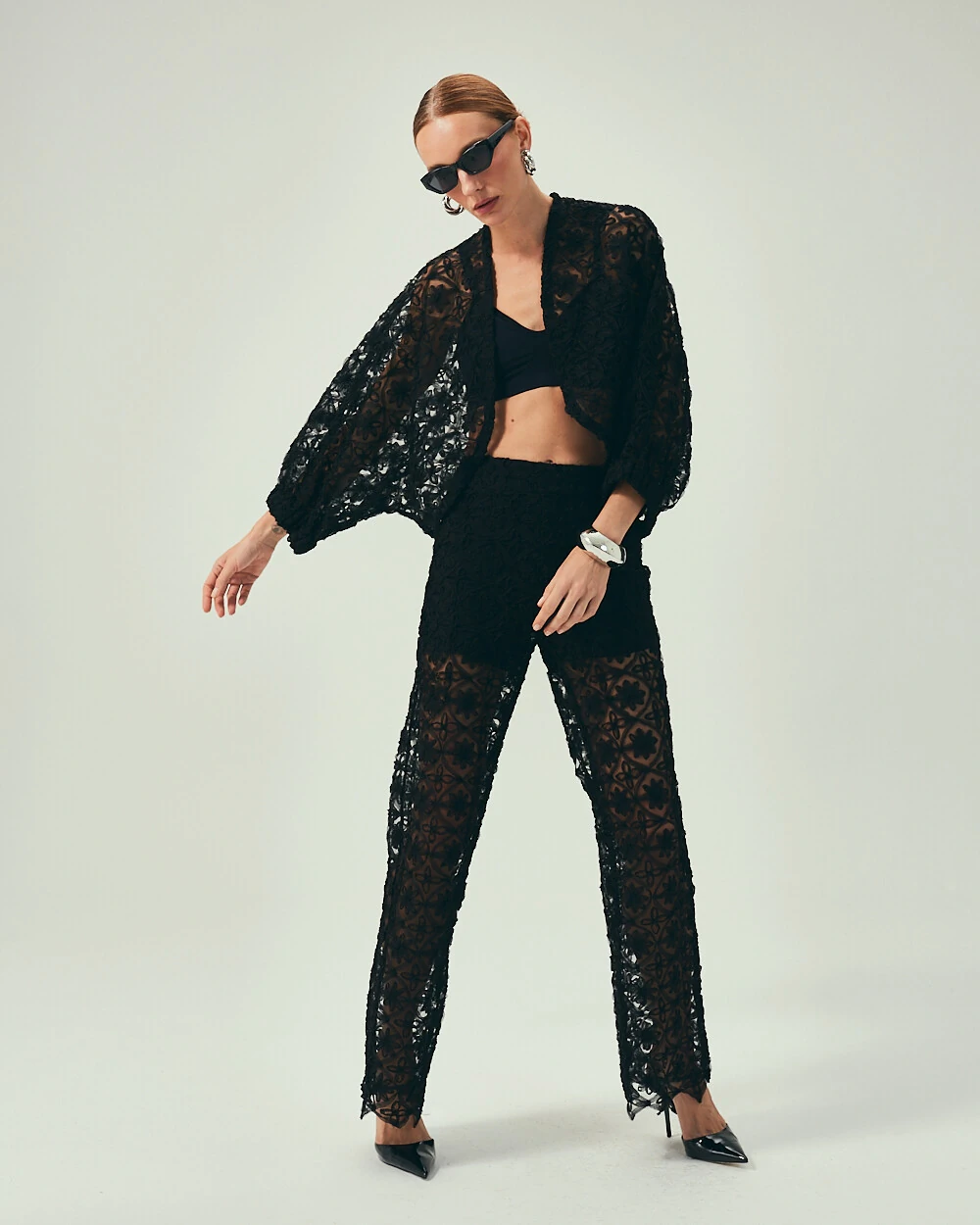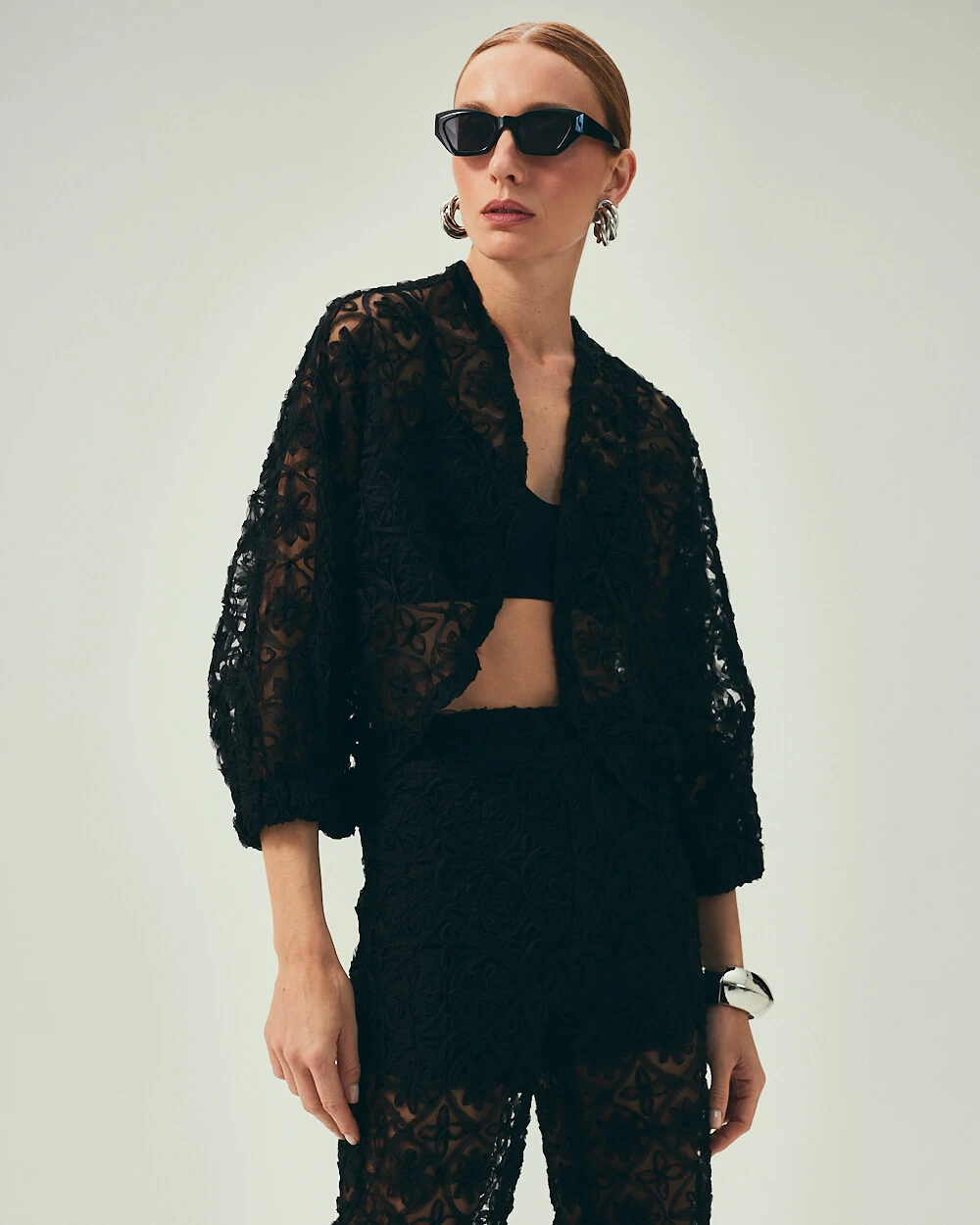 O Bolero Fleur Noir traz textura rendada e transparência na medida, criando um visual marcante e delicado. A modelagem leve acompanha o corpo com naturalidade, enquanto o desenho do tecido adiciona profundidade ao look.