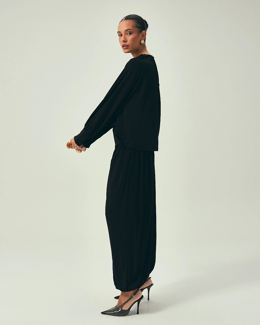 É uma peça que envolve o corpo sem marcar, criando uma sensação de fluidez contínua. Confeccionada em tecido leve e macio ao toque, possui mangas longas com volume, punhos ajustados e decote com acabamento franzido.