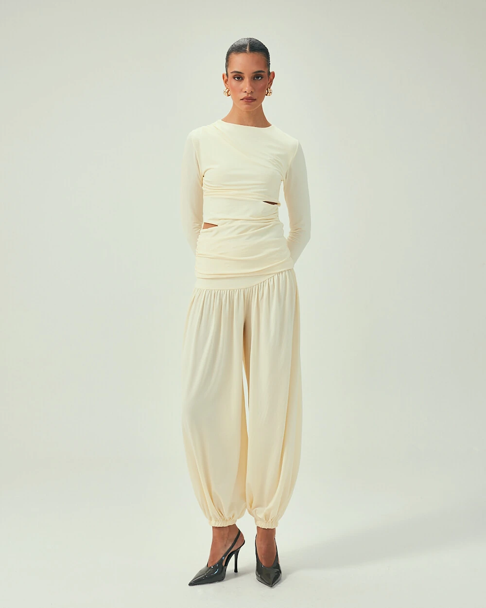 A Calça Leger tem um caimento solto que traz liberdade ao vestir, mas sem perder a elegância. O ajuste na cintura e nos punhos cria uma silhueta equilibrada, deixando o look arrumado mesmo nas produções mais descomplicadas.